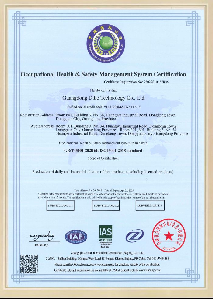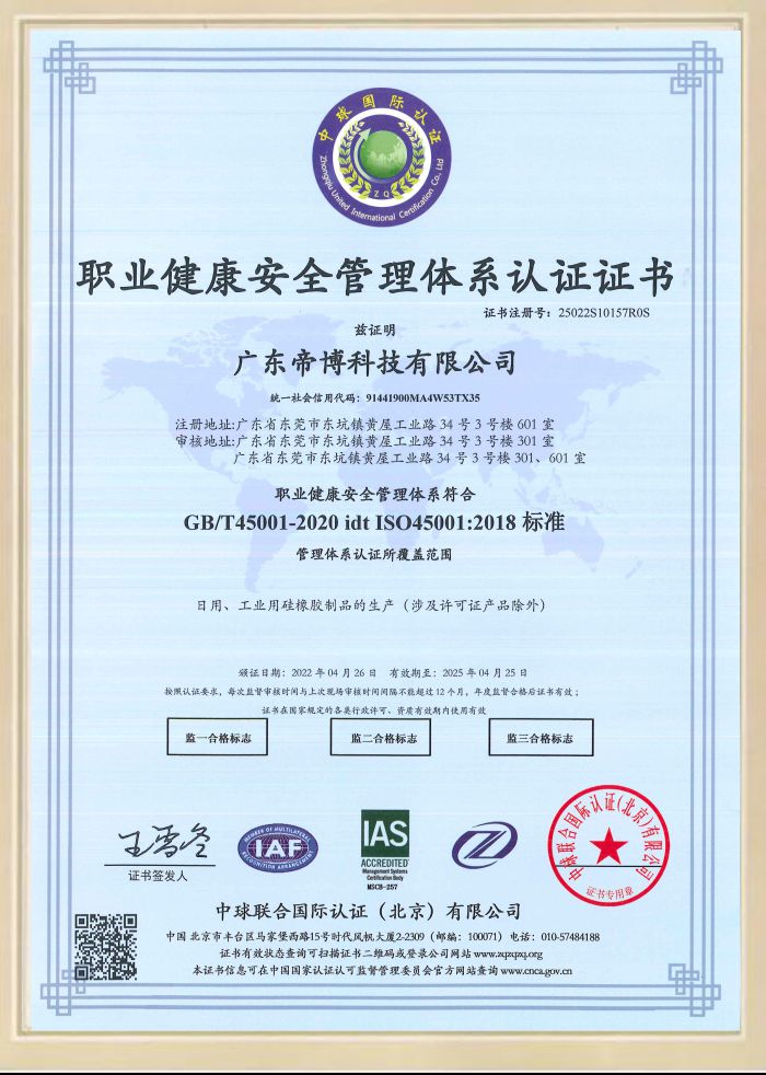 廣東帝博科技有限公位于2019年起施行每年檢測認證報告,由于硅膠制品行業屬于環保安全行業,客戶的需求以及反饋都決定我們的實力,目前我司已認證ISO9001、ISO14001、ISO45001、迪士尼認證、FDA、ROHS、LFGB、CPC等一系列檢測認證
