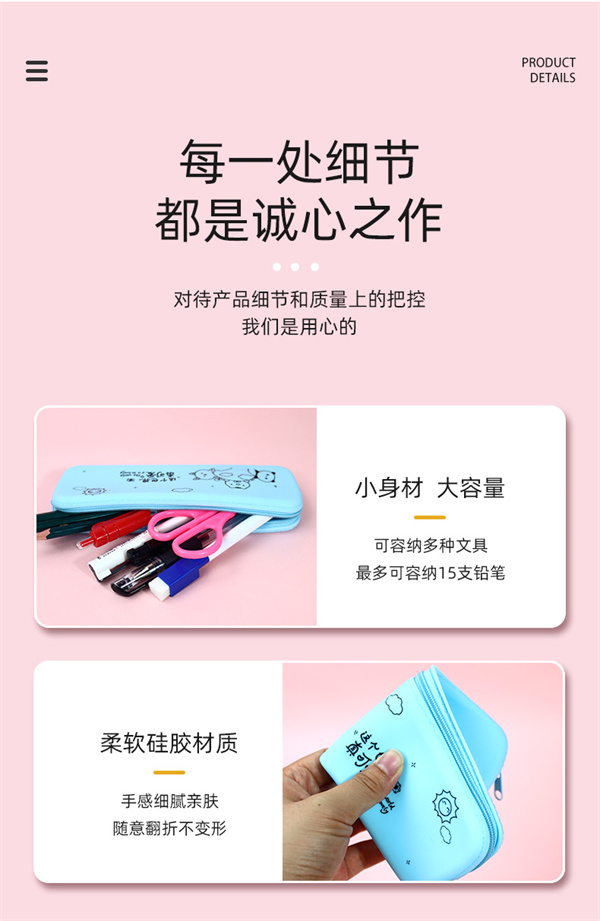 硅膠筆盒采用車縫式拉鏈結構結合成型,產品在使用過程中可以輕松拿取其中的文具用品,優質防水耐磨拉鏈可以任意折疊曲折不變形,不斷裂,食品級高拉力氣相膠材質可以長期與筆墨水接觸不產生壽命問題,硅膠筆袋耐磨性良好,可以防止使用時導致摔落和摩擦,清洗方便,可防摔耐磨,任意按壓不易變形。