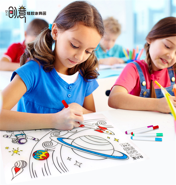 硅膠涂鴉畫主要采用兒童教育方式提升兒童動手能力,以及親子教育知識學習等效果,培養兒童的認知以及專注力以及藝術創造能力等,產品主要采用環保硅膠片結合轉印印刷底色方式提供一定的表面圖案知識,經過水性水彩筆涂鴉達到創作的效果!