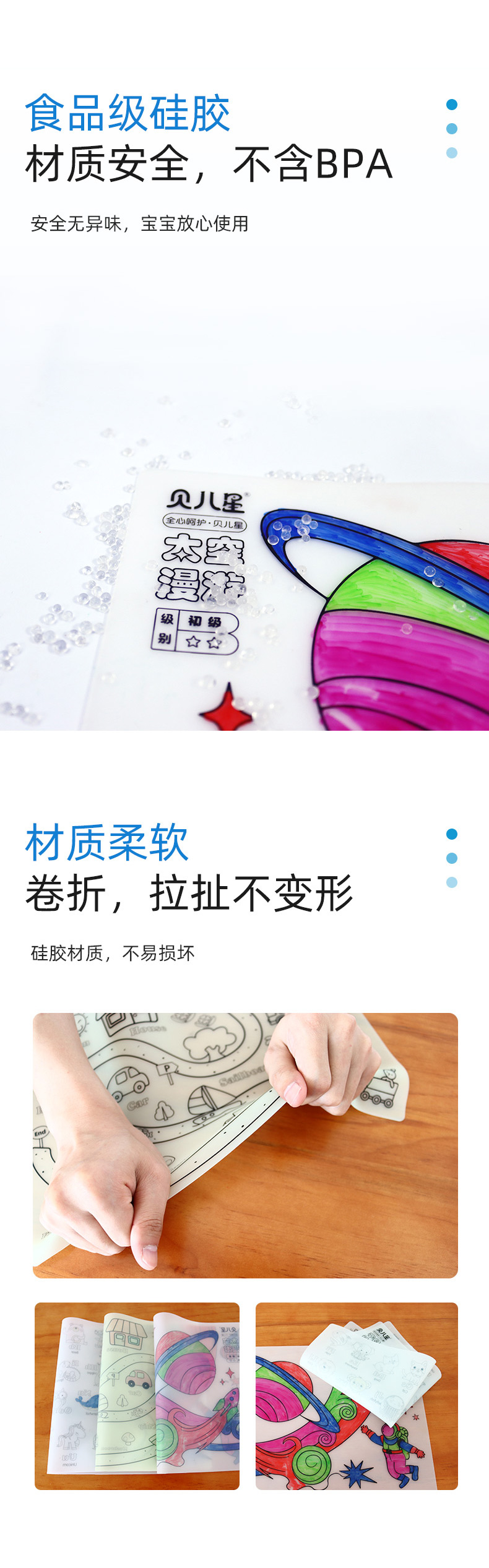 硅膠涂鴉畫板產品的主要買點源于產品的表面圖案以及配套的創意,產品從6-12歲之間具有不同的主題與認知圖案,可以連接整體進行學習提升大腦開發,加強兒童動手能力以及創新創作能力,此外產品配比水性可清洗彩色筆,不會對硅膠表面產生筆污以及筆畫痕跡,材料屬于柔軟回彈食品級硅膠,所以硅膠店鋪可以任意曲折來回折疊不會變形損壞,此外硅膠墊片可水性可隔熱,可耐高低溫,可以在多個行業領域當中運用!
