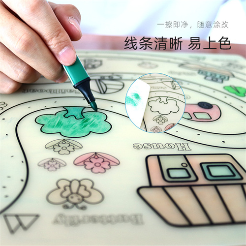 材料環保柔軟,硅膠墊廠家采用優質食品級硅膠材料生產加工,經過高溫200度將模紙轉印二次成型達到表面底色圖案效果,過200度高溫具有優良附著力,多種創作思維底色圖案,可鍛煉兒童的思維能力以及創作能力,優質水性筆不留筆污色痕,可可隨意涂改反復使用,反復涂鴉!